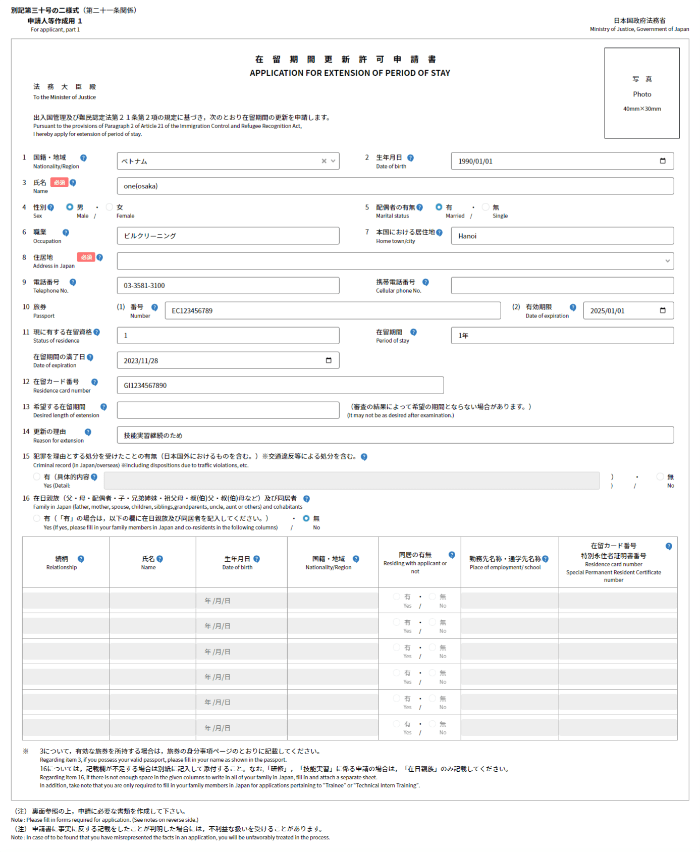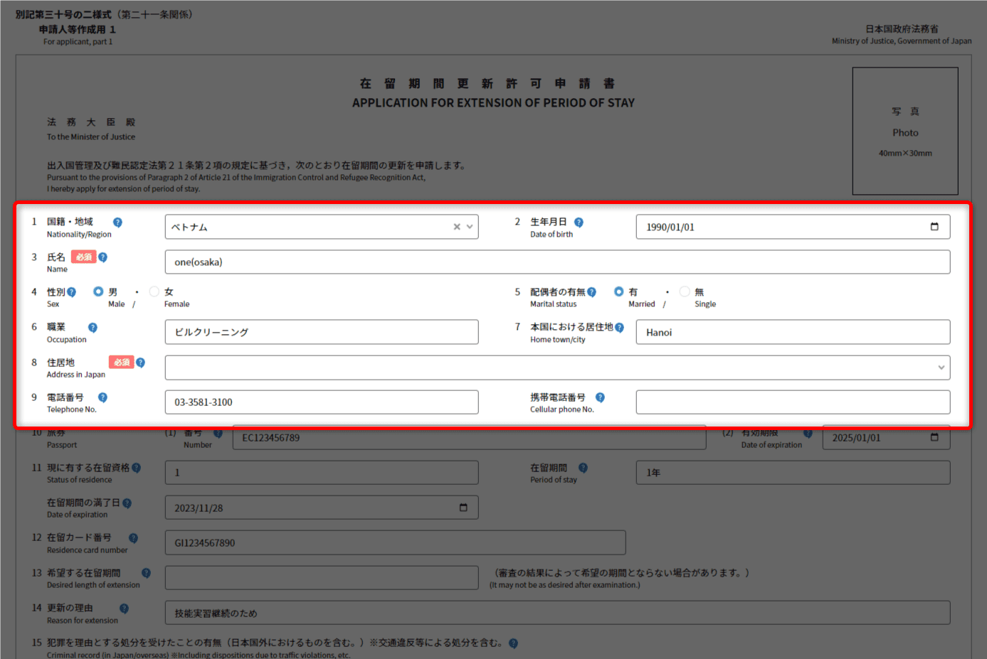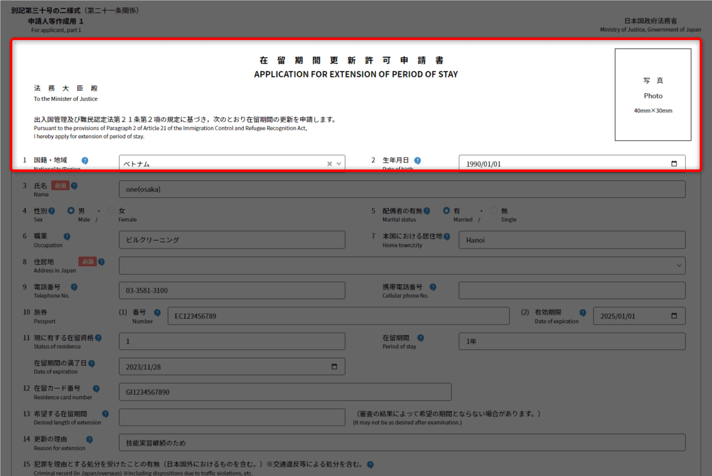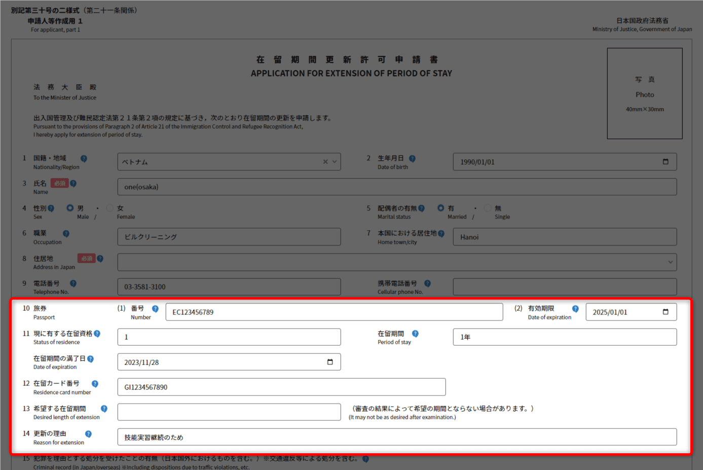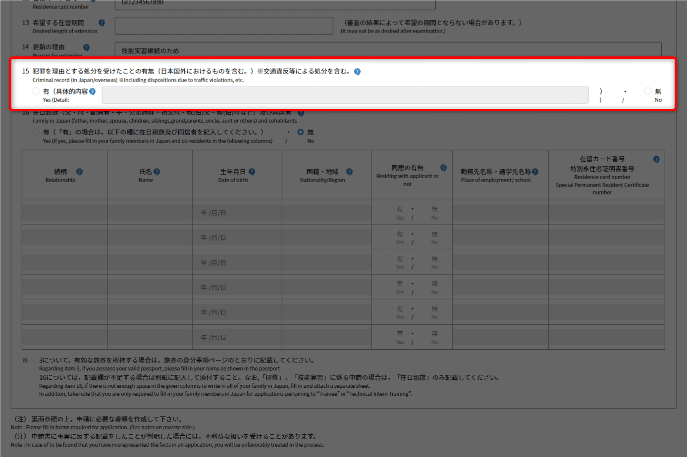 在留カード番号、希望する在留期間、更新の理由
