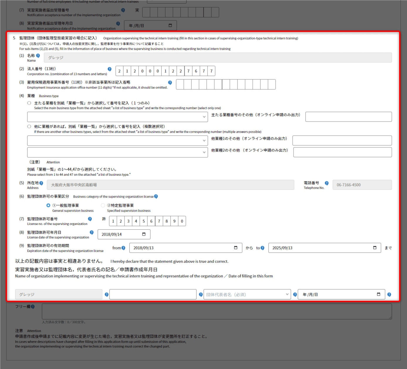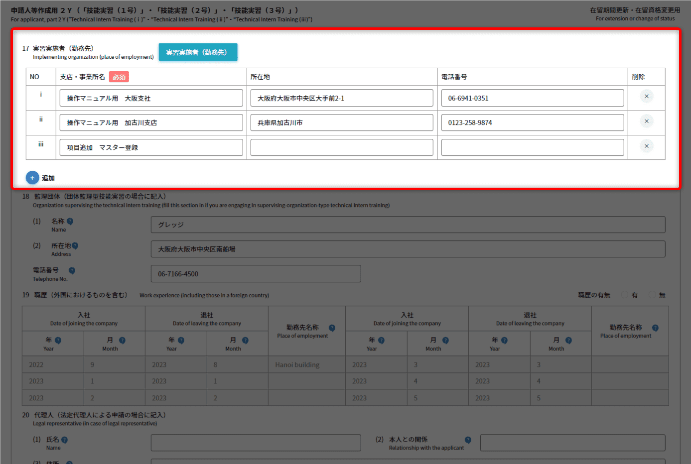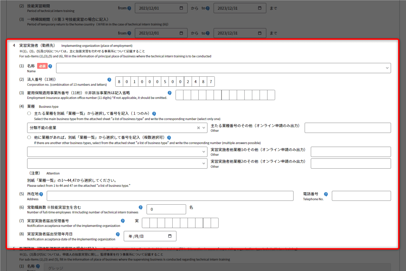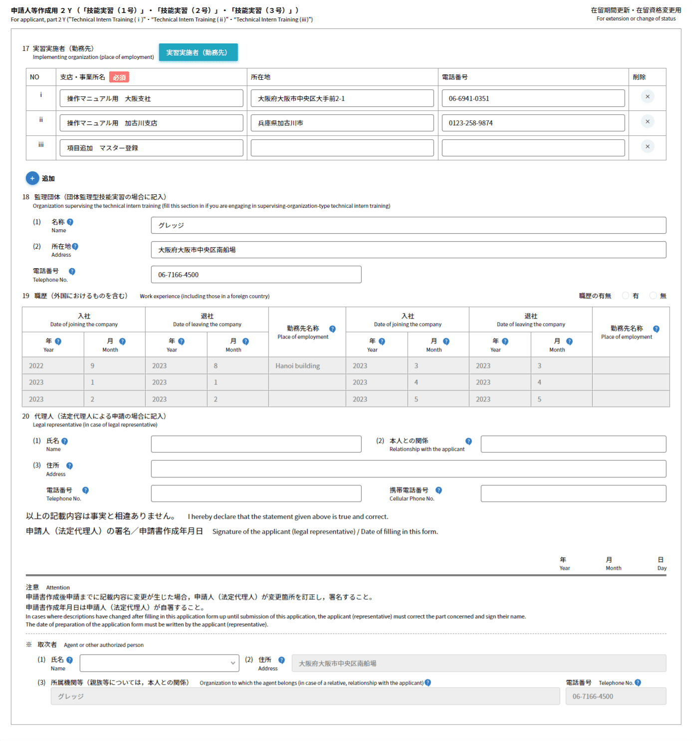 - 主に技能実習を行わせる事業所について、登記通りに入力してください。