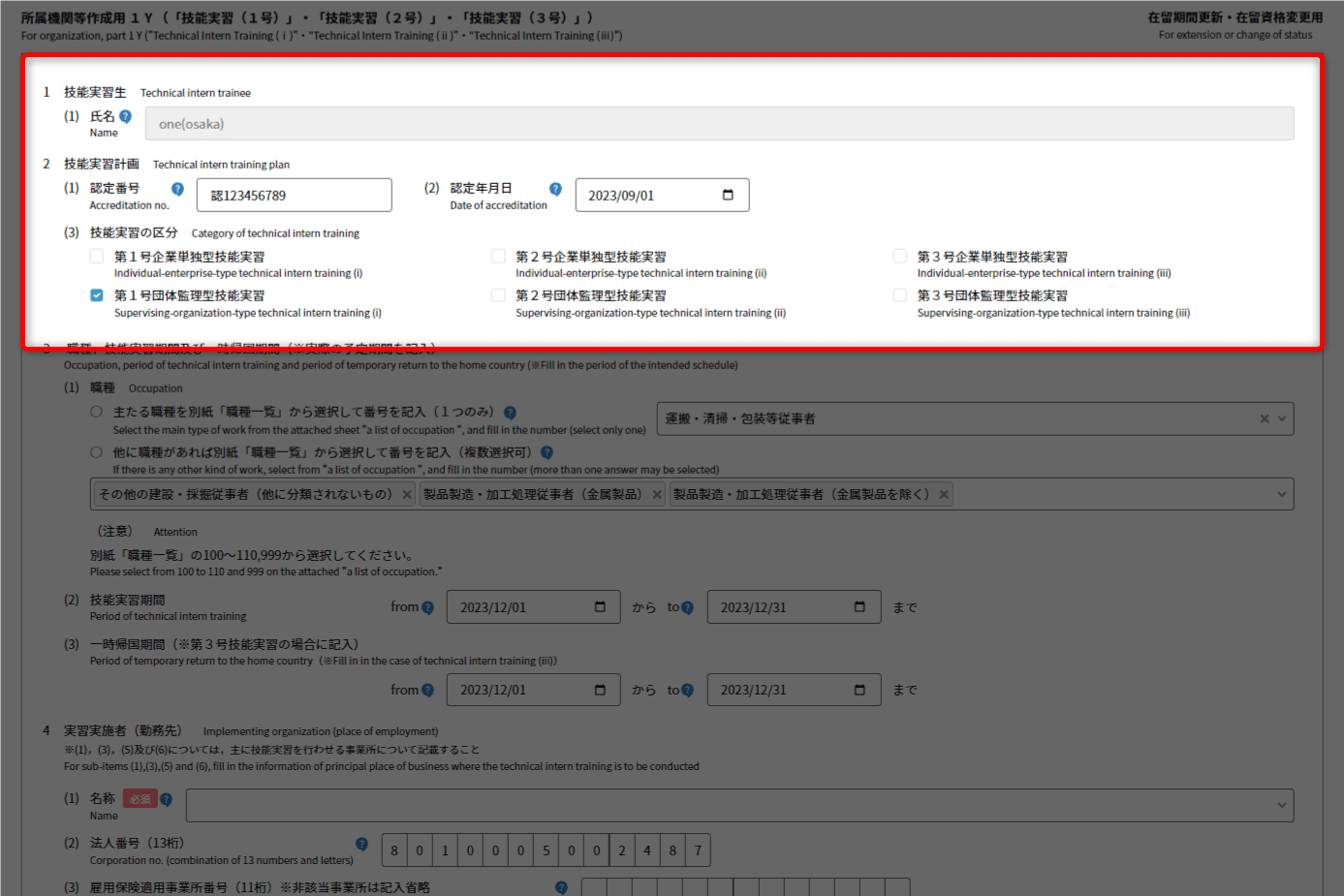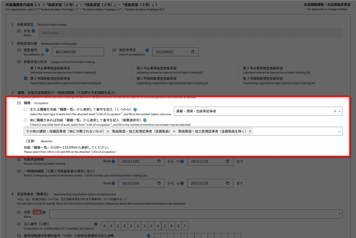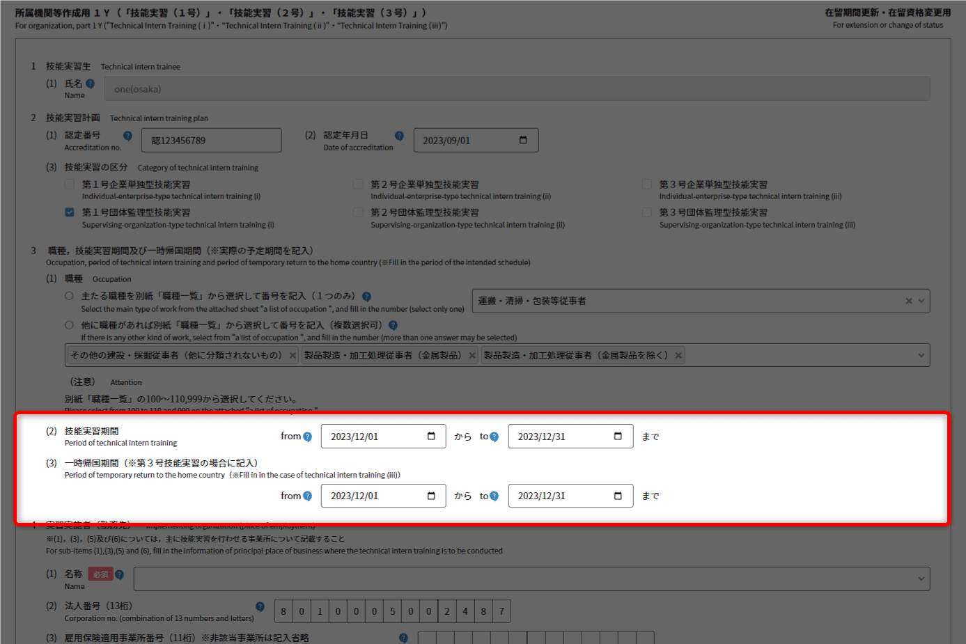 (帰国予定時期(始))と(帰国予定時期(終))が反映されます。 - 第3号技能実習の場合に入力が必要となります。