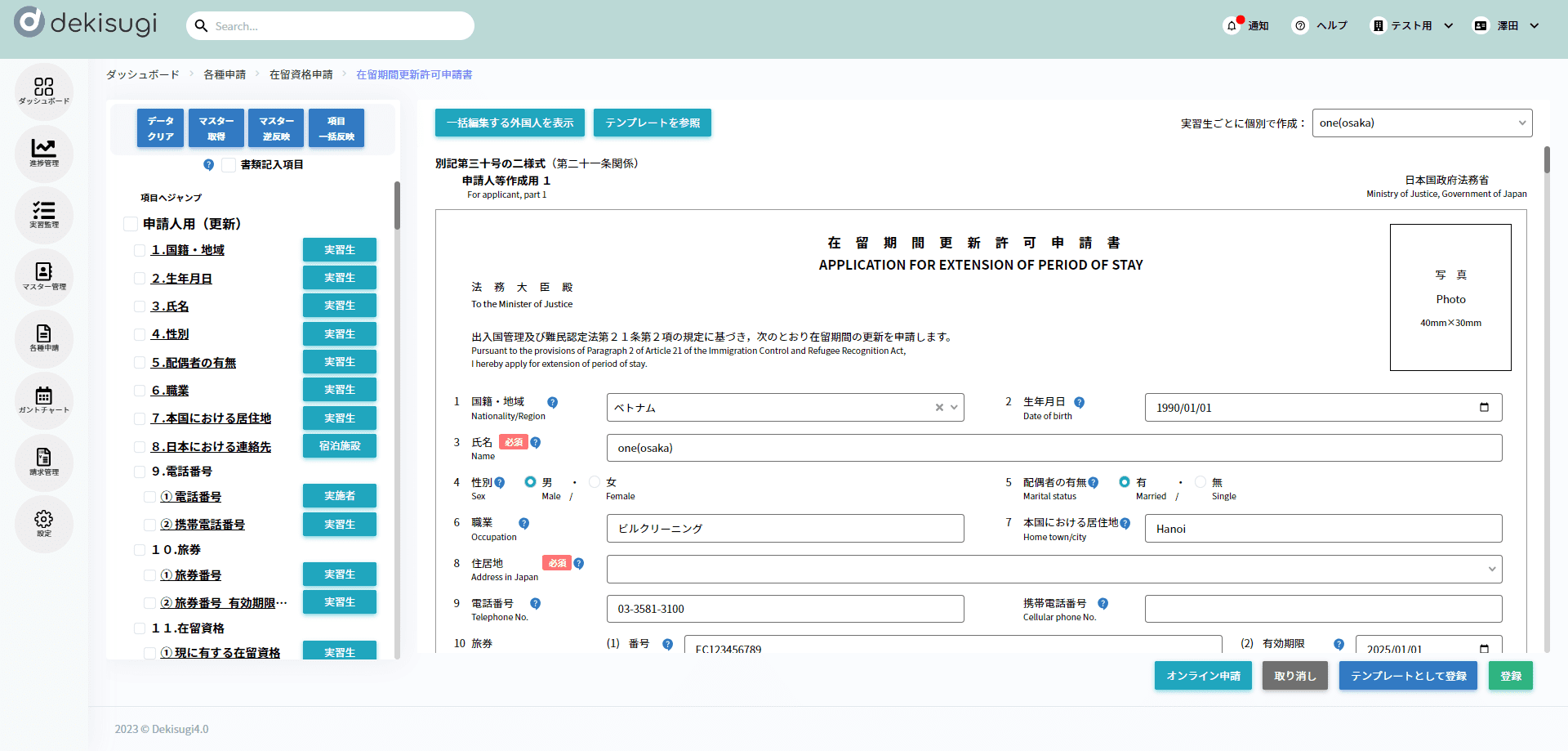 5.「在留期間更新許可申請書」の帳票編集画面が開きます。