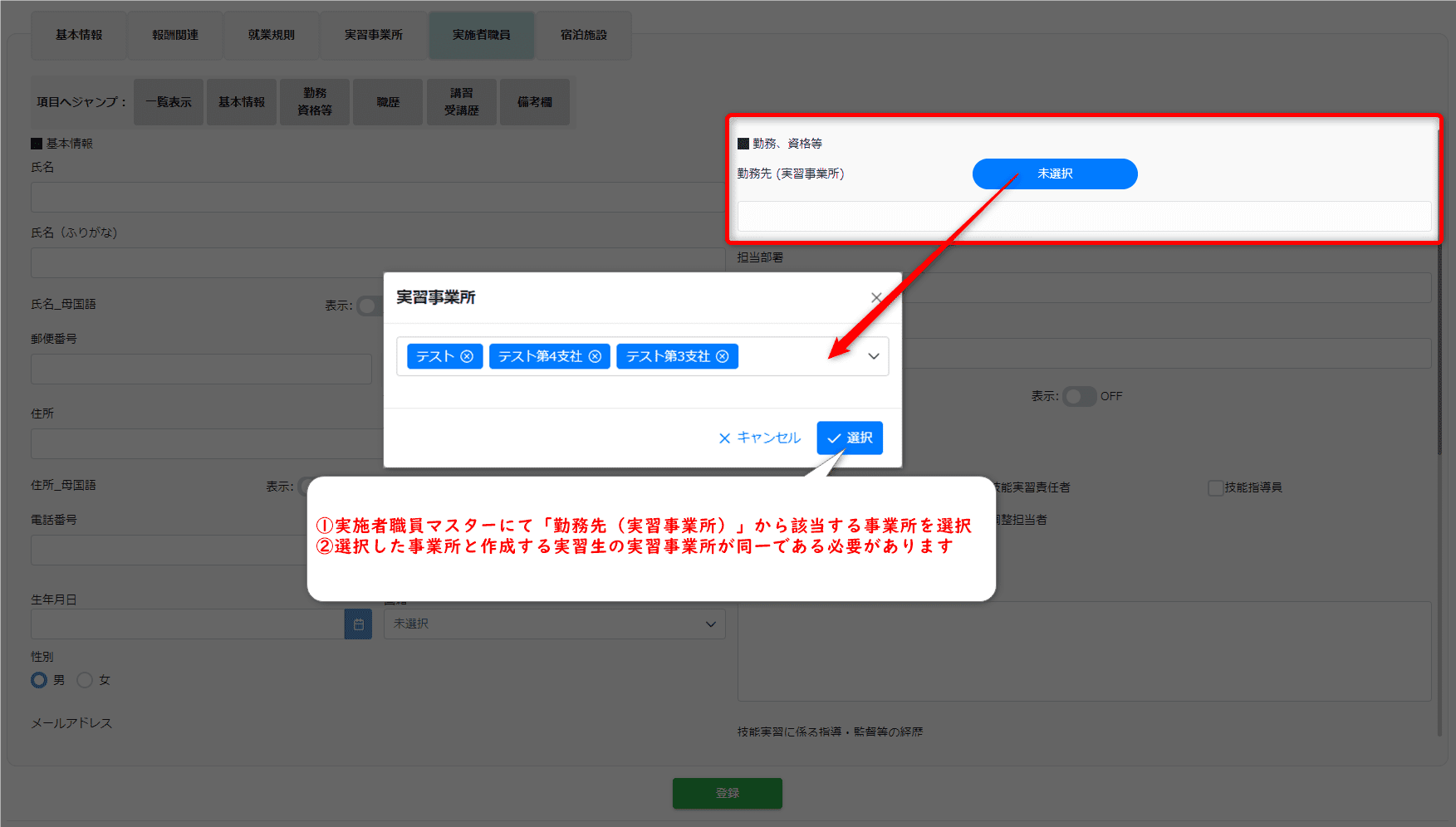 • 実施者職員マスターにて「勤務先(実習事業所)」から該当する実習事業所を選択している