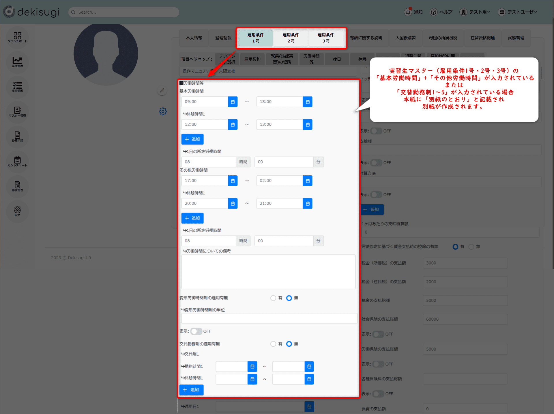 労働条件をクリックすると、マスターに登録されている内容を表示します。