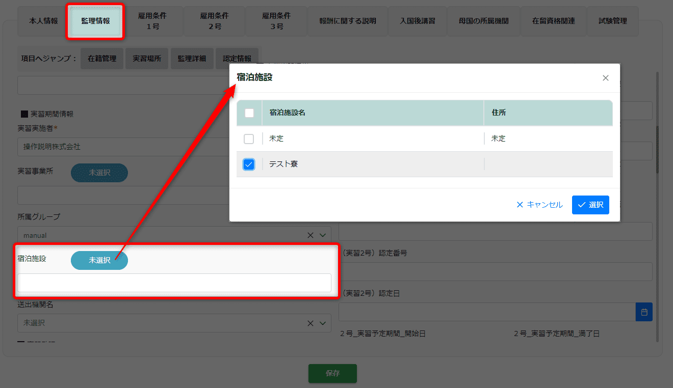 • 実習生マスタにて「宿泊施設」/「宿泊施設選択」から該当する宿泊施設を選択している