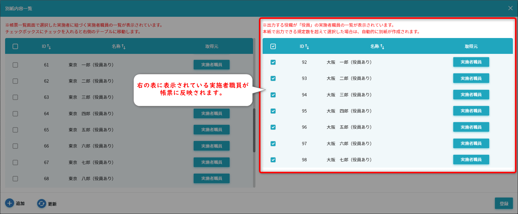 • 実施者職員マスターにて役員の情報が7名以上登録おり、かつ対象の役員を7名以上選択している
