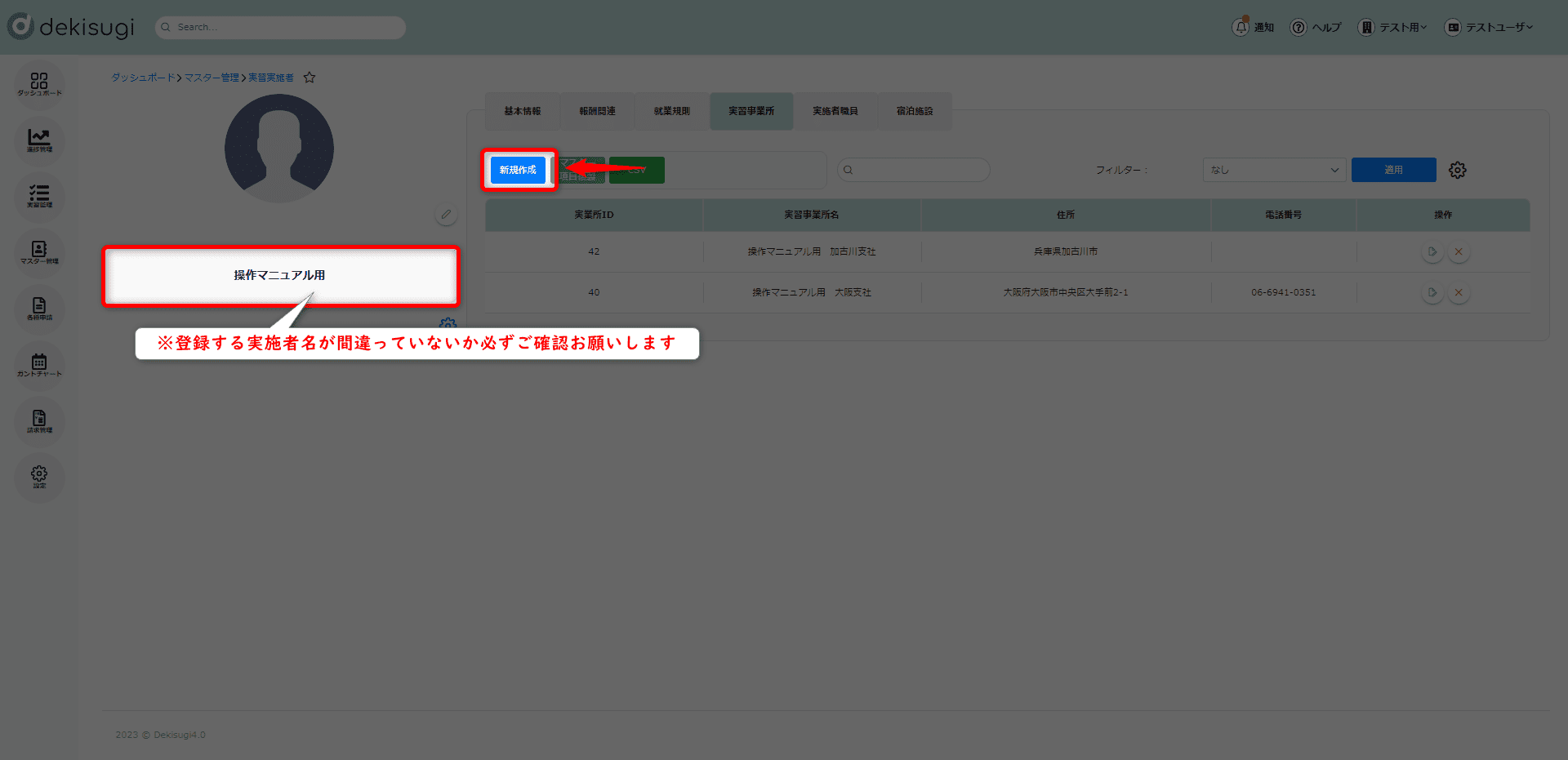 3. 新規タブで実習実施者マスター画面が開きますので、新規登録を行ってください。