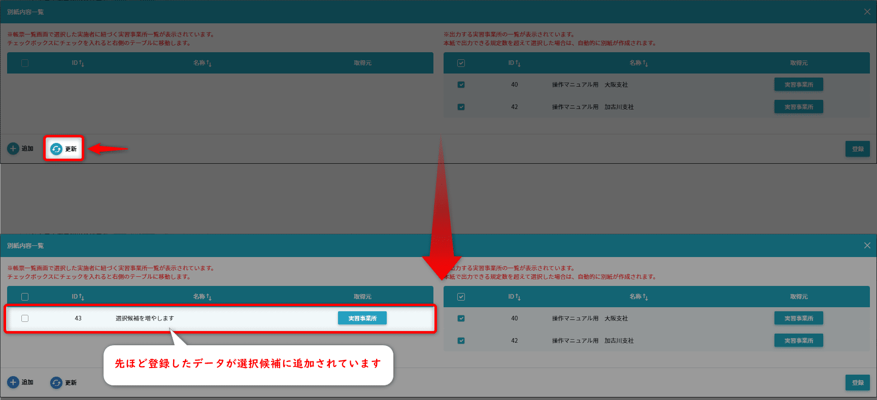 更新」をクリックし先ほど登録したデータが選択候補に追加されるかご確認ください。