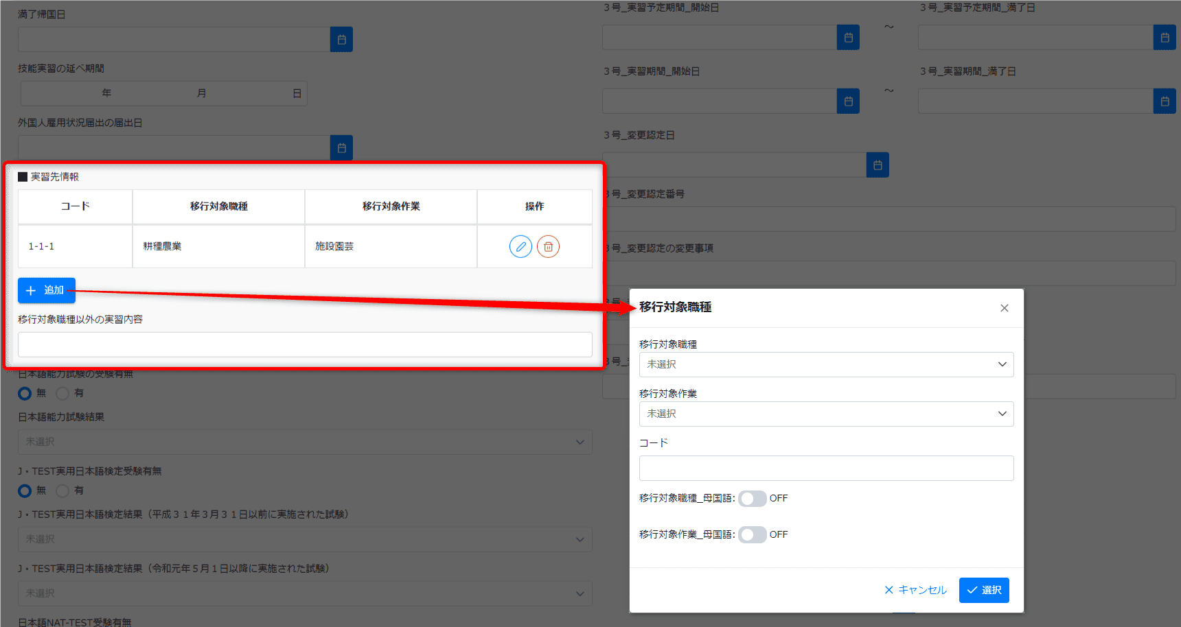 • 実習生マスターにて「移行職種」が選択されている