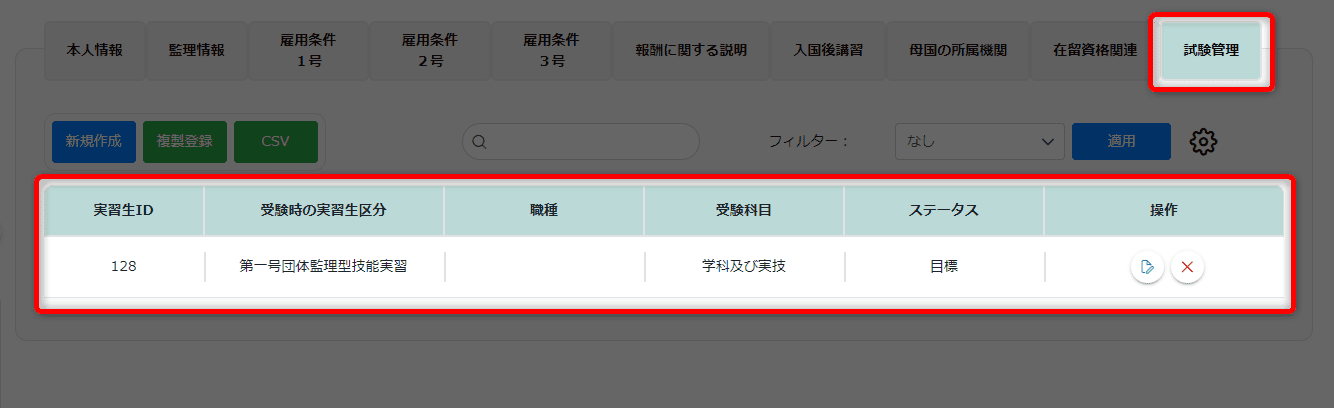 • 試験管理で登録している「実習生区分」が、作成する技能実習計画の「実習生区分」のひとつ前の区分である