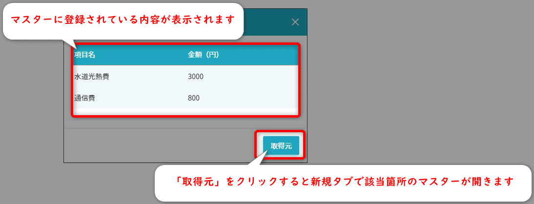 定期的に負担する費用をクリックすると、マスターに登録されている内容を表示します。