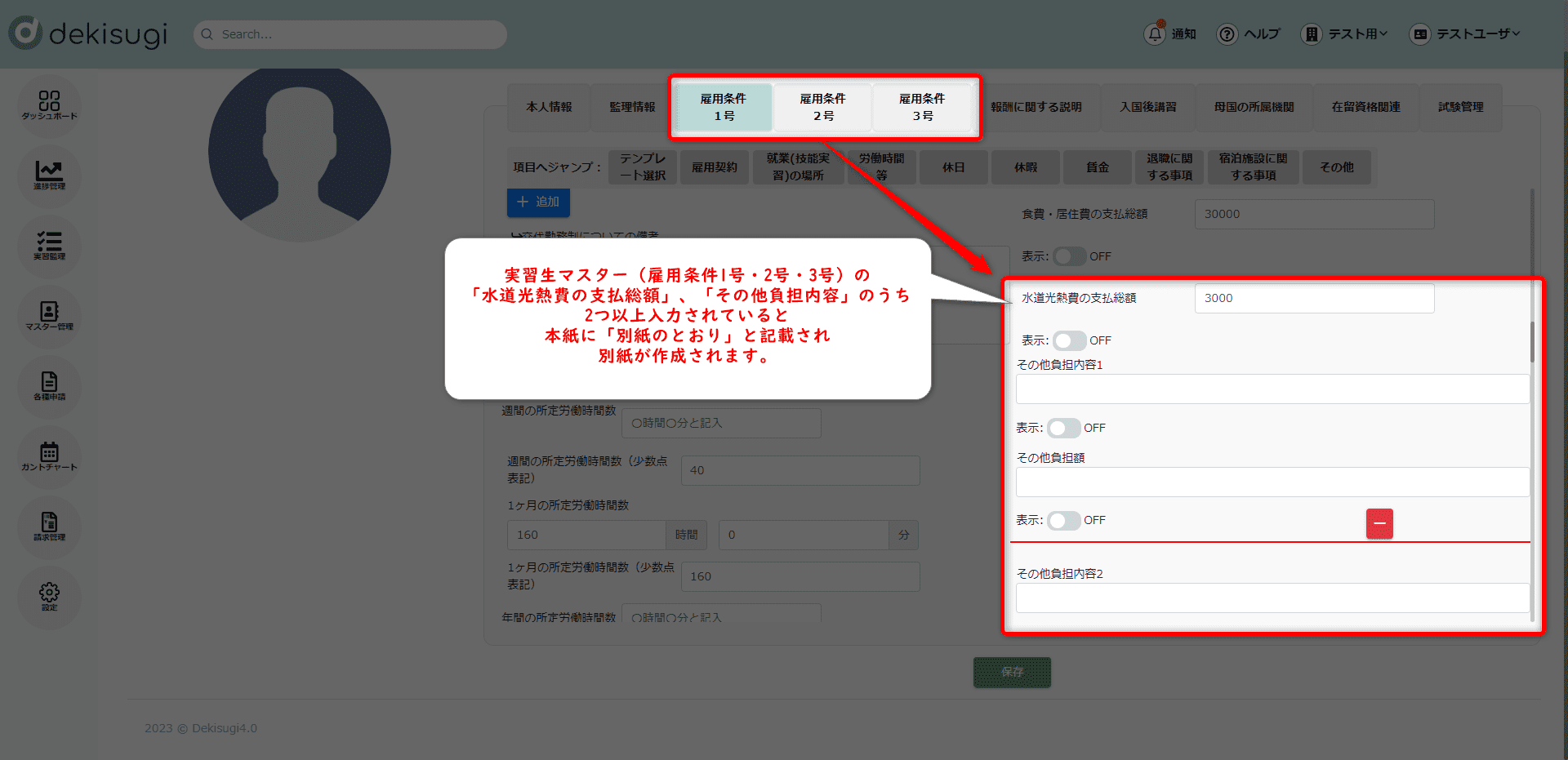 • 実習生マスターにて「水道光熱費」、「その他負担内容」のうち、2つ以上入力されている