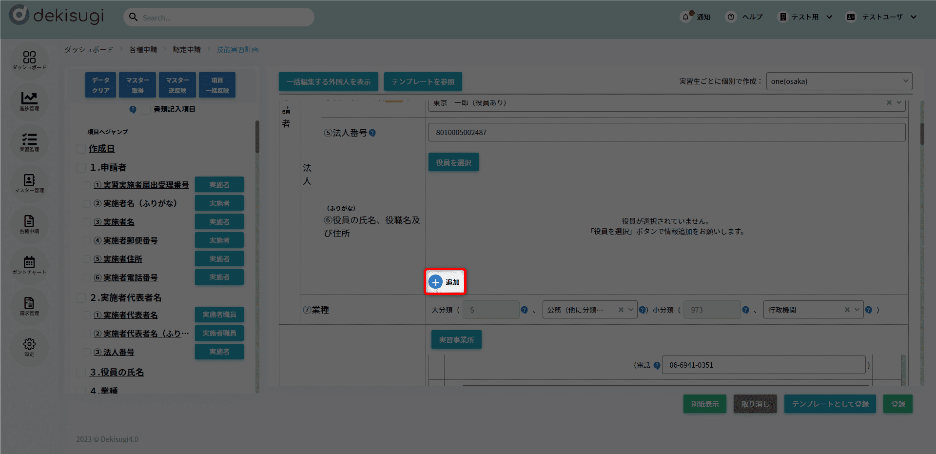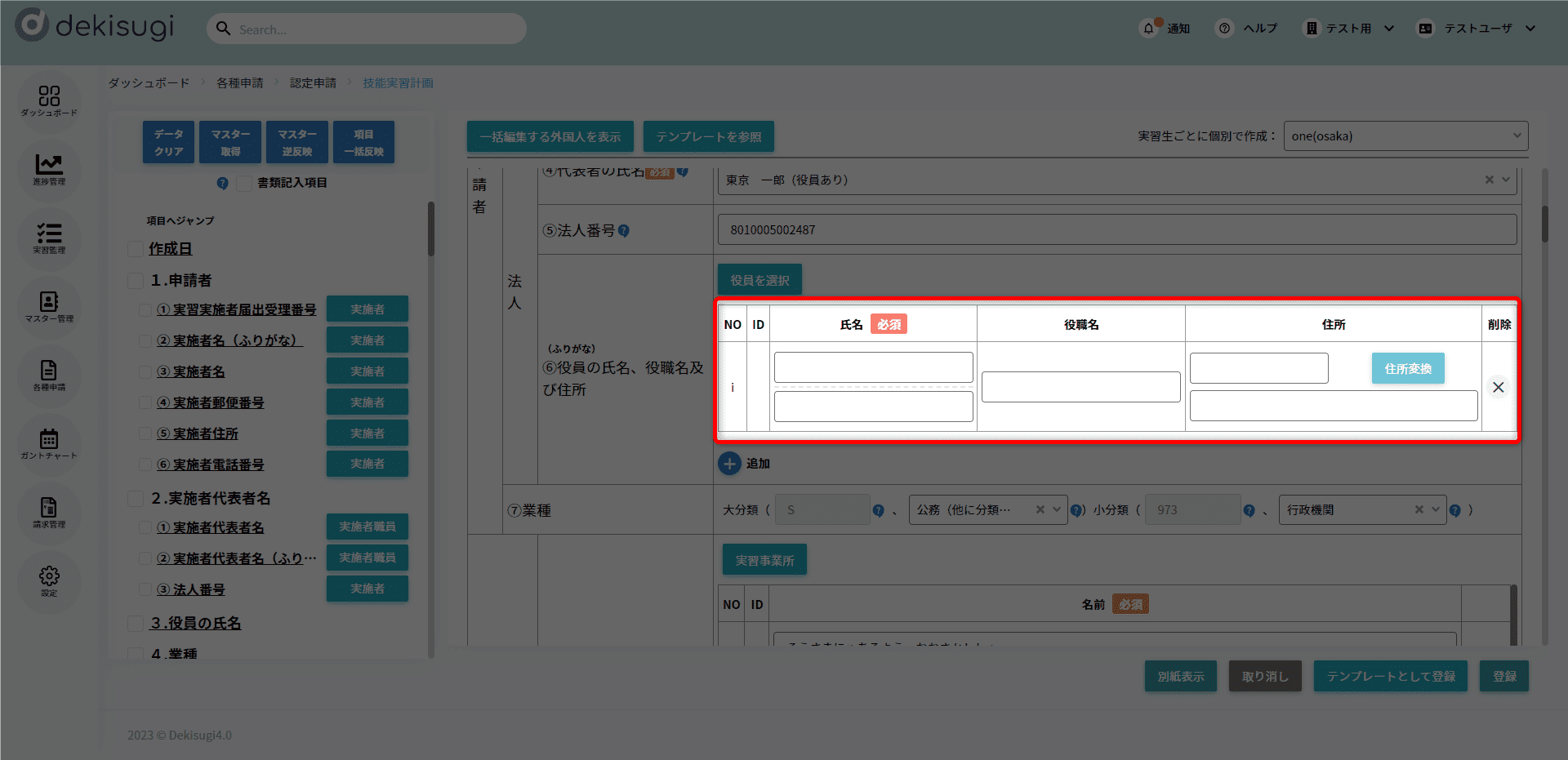 • 技能実習計画の帳票編集画面にて対象の役員を選択されている